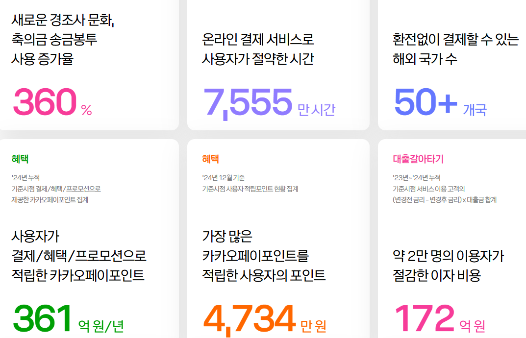 먼저 카카오페이 송금 서비스는 지난 4년간(2021년~2024년) 시중은행 대비 약 8495억 원의 이체 수수료를 절감하는 효과를 낳았다. 막대한 돈이다. 여기에 건당 소요시간을 180초에서 20초로 단축하며 전 국민의 시간을 총 1억 5600만 시간이나 아껴주었다. 온라인 결제 역시 일반 카드 대비 소요 시간을 50초 단축하며 누적 7555만 시간을 절약했다. 절약의 화신이다.