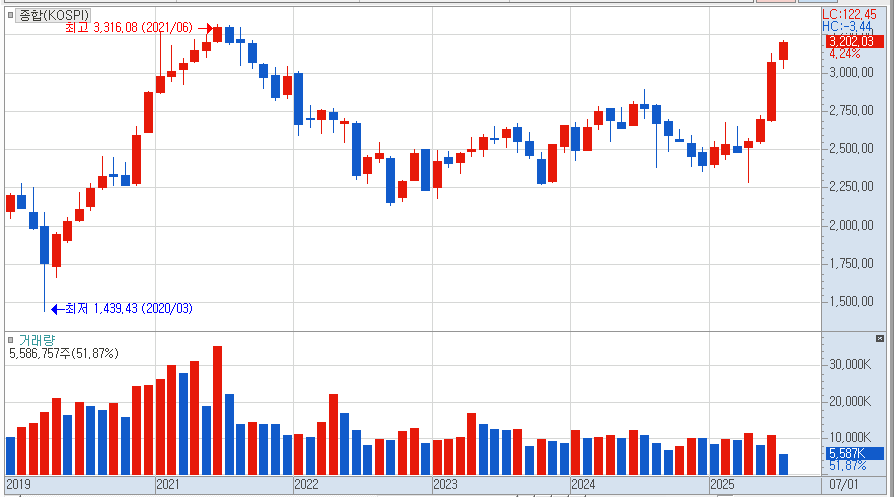 2021년 6월 21일 코스피 지수는 역사적 신고가인 3.316.08P를 기록 하였습니다. 그로부터 4년에서 이틀이 모자라는 오늘 2025년 7월14일 코스피 지수는 3.202.03P를 기록해 역사적 신고가 돌파를 눈 앞에 두고 있습니다. 이제 3.57%, 115P만 더 오른다면 또 다시 역사적 신고가를 기록하게 됩니다. 2021년, 신고가를 기록한 이후 곧 바로 약세로 돌아섰었기에 모든 촉각을 곤두 세우며 몇 포인트나 남았나 계산 해 보고 있습니다. 본격적인 강세장으로 진입 할 것인지도 확인 해 보고, 미국과의 관세협상(관세전쟁), 금리 인하 여부, 미국 부채한도와 관련 한 X - date, 마무리 되지 않은 중동과 우크라이나의 전쟁, 낮은 경제 전망치 등 부정적인 요소가 시장에서 어떻게 받아들여 질지도 궁금하기 때문입니다. 그래도 6월 한달 동안 코스피가 강한 상승을 보였기에 강세장의 특징과 단계를 살펴 보고 시장 대응 전략도 검토 해 보겠습니다.