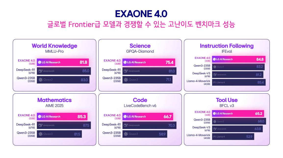 | EXAONE 4.0 VL | 2025년 7월 | 멀티모달(Vision-Language) | 메타 Llama 4 Scout 능가 | - |