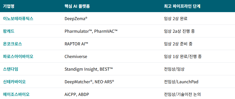 - 이노보테라퓨틱스(Innovotherapeutics): 자체 AI 플랫폼 '딥제마(DeepZema®)'를 활용해 흉터 치료제 등 임상 2상 단계의 파이프라인을 다수 보유하고 있습니다.