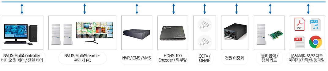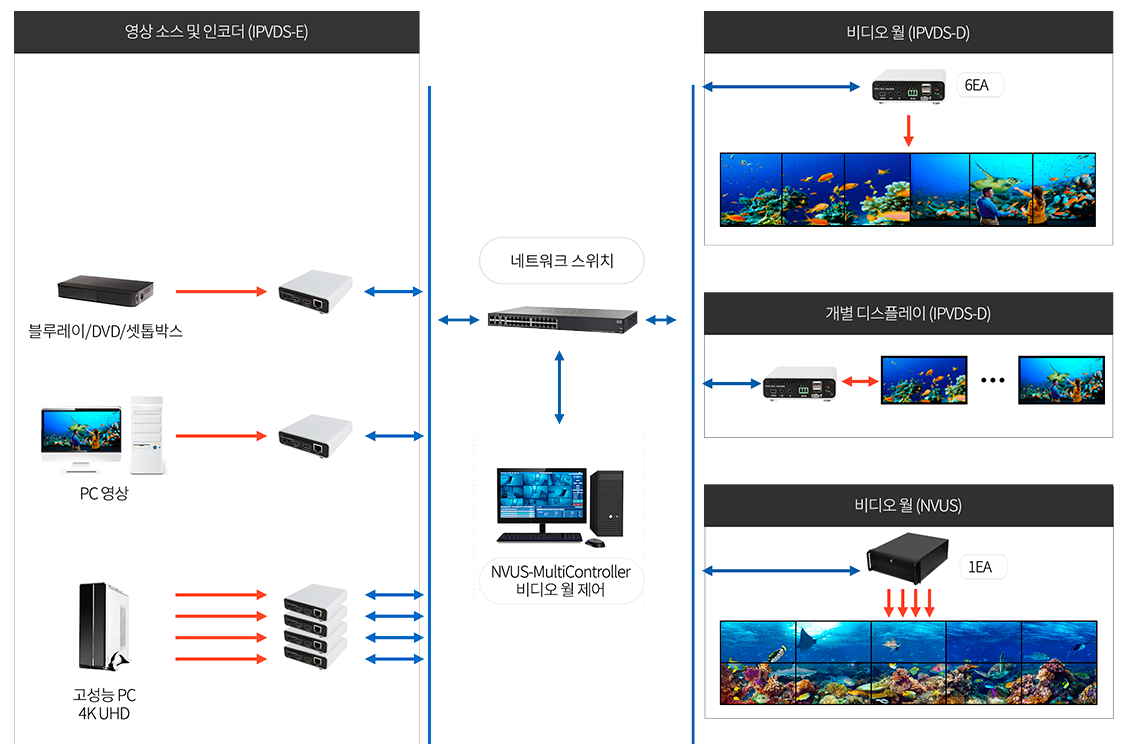 - IP 비디오 월 컨트롤러 및 미디어 플레이어 (IP Video Wall Controllers & Media Players): IPVDS-700-ED (4K HDMI IP 비디오 월 컨트롤 솔루션), NVUS (IP 비디오 월 컨트롤 솔루션), MPDS-100 (Full HD 미디어 플레이어) 및 NVUS-MultiController (통합 제어 프로그램) 등을 포함한다. 이 솔루션들은 TCP/IP 네트워크 기반으로 다양한 콘텐츠를 재생하고 제어할 수 있는 유연성과 확장성을 제공한다.
