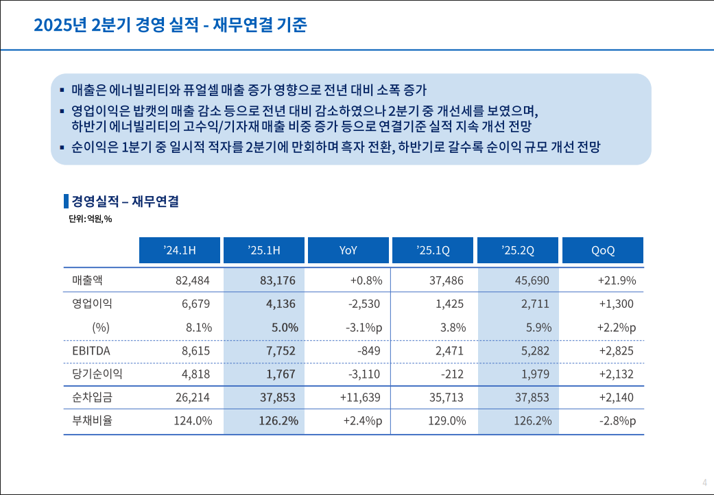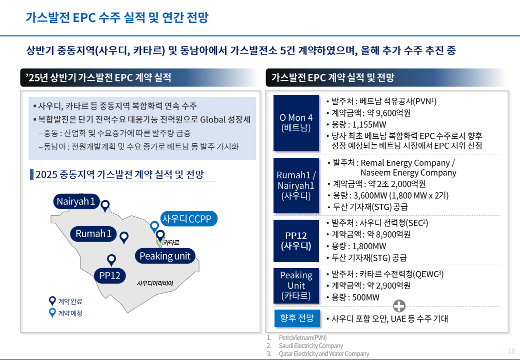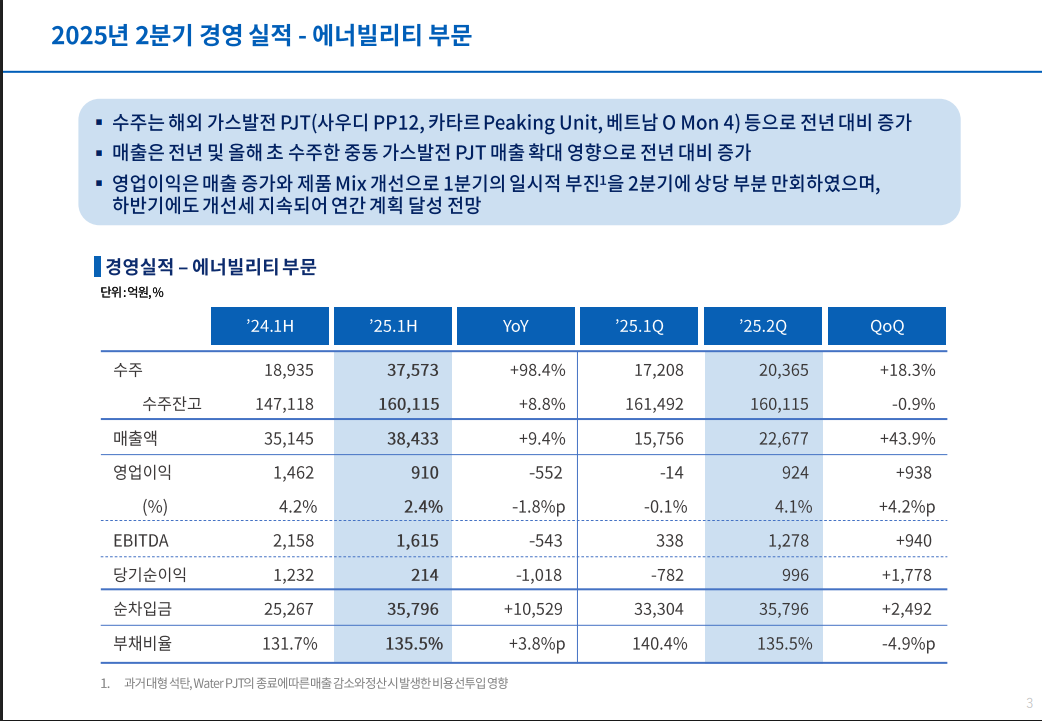 두산에너빌리티는 IR에서 "이번 실적 반등은 고수익 프로젝트 매출 비중 확대 덕분"이라고 발표 했습니다. 1분기에는 과거 대형 석탄·워터 프로젝트 종료에 따른 정산 비용이 선반영되면서 손실을 기록했지만, 2분기부터는 중동 가스발전 프로젝트 등 고수익 사업이 본격 반영되면서 수익성이 빠르게 회복되었습니다. 현재 50% 수준이던 고수익 프로젝트 비중은 연말에는 80% 수준까지 확대될 것으로 예상돼 향후 수익성도 더 개선될 것으로 보입니다.