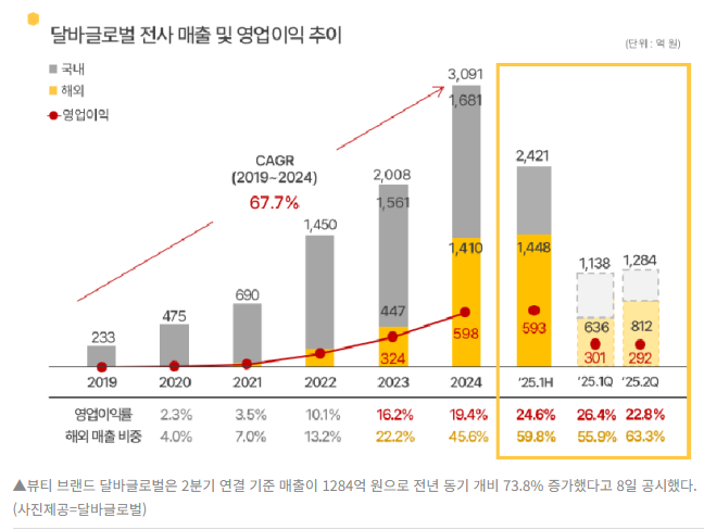 '승무원의 미스트'로 유명한 뷰티 브랜드 달바글로벌은 2분기 연결 기준 매출이 1284억 원으로 전년 동기 개비 73.8% 증가했다고 8일 공시했습니다. 실적 발표일을 앞두고 상승을 이어가던 달바글로벌의 주가는 발표일 당일 신고가를 기록하고 정규장에서는 약 보합으로 끝났으나 넥스트마켓에서 - 14% 라는 큰 폭의 하락을 나타내며 장을 마감하였습니다.