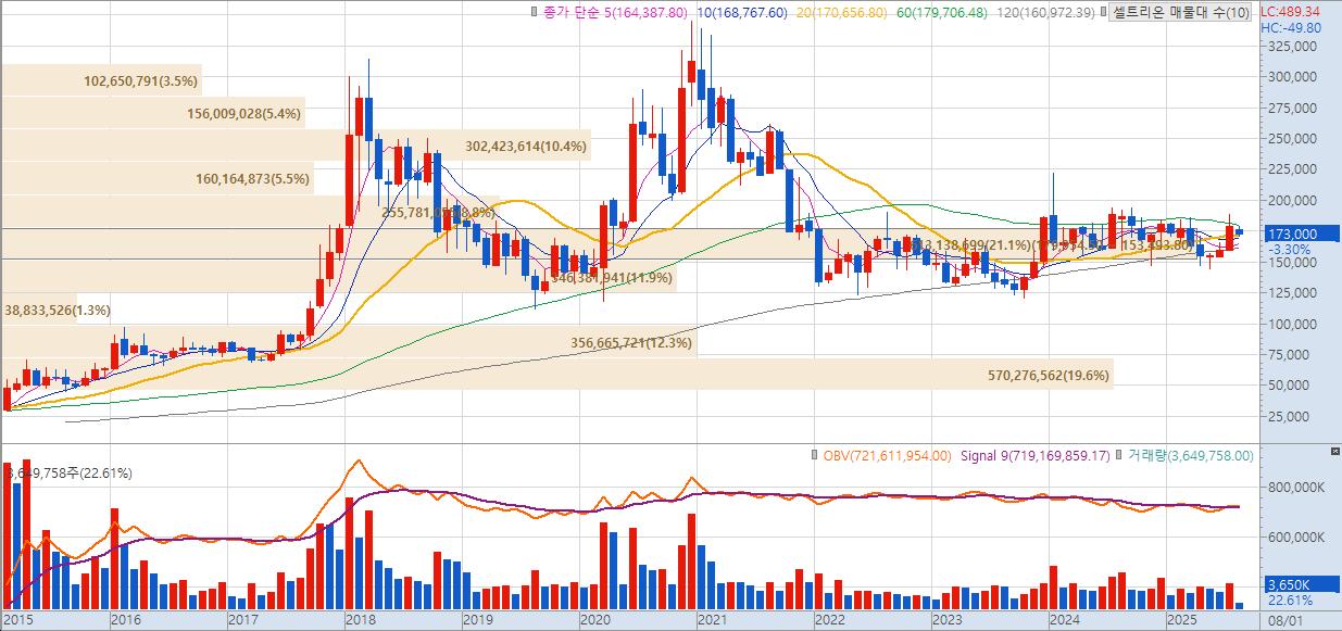 기술적 측면에서 보면 코로나 상승기에 고점을 찍은 이후 2022년 부터 장기적인 박스권을 형성 하고 있습니다. 트리거가 작동 한다면 상승할 에너지가 충분히 모여지고 있습니다. 배당정책에 있어서도 셀트리온은 2027년까지 3년간 평균 "주주 환원율 40%"를 달성하겠다는 목표를 제시했습니다. 2024년 배당수익율은 2025년 5월에 결정된 무상증자(보통주 1주당 신주 0.04주 배정)를 포함 해 약 5.75%의 배당율을 기대할 수 있습니다